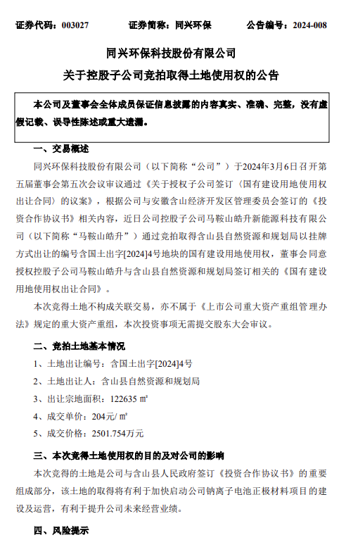 根據(jù)公告顯示,近日公司控股子公司馬鞍山皓升新能源科技有限公司通過競拍取得含山縣自然資源和規(guī)劃局以掛牌方式出讓的編號含國土出字[2024]4號地塊的國有建設(shè)用地使用權(quán),該土地的取得將有利于加快啟動同興環(huán)保鈉離子電池正極材料項目的建設(shè)及運營。