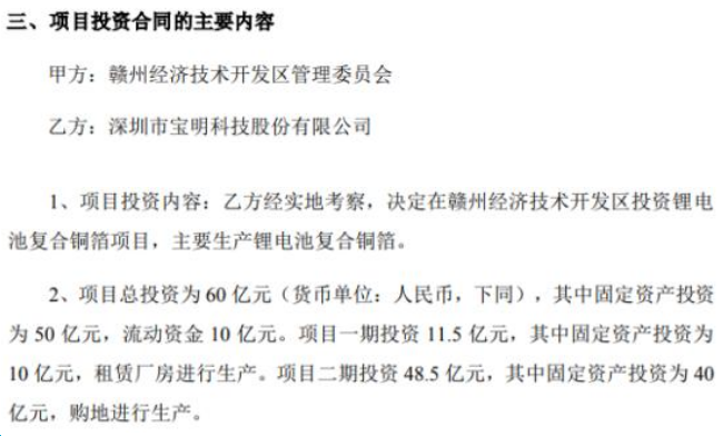 7月27日,寶明科技(002992)發(fā)布公告,深圳市寶明科技股份有限公司(以下簡(jiǎn)稱“公司”)分別于2022年7月6日召開第四屆董事會(huì)第二十三次(臨時(shí))會(huì)議、2022年7月22日召開公司2022年第三次臨時(shí)股東大會(huì),審議通過了《關(guān)于在贛州投資建設(shè)鋰電池復(fù)合銅箔生產(chǎn)基地的議案》,同意公司在贛州經(jīng)濟(jì)技術(shù)開發(fā)區(qū)投資建設(shè)鋰電池復(fù)合銅箔生產(chǎn)基地,主要生產(chǎn)鋰電池復(fù)合銅箔。